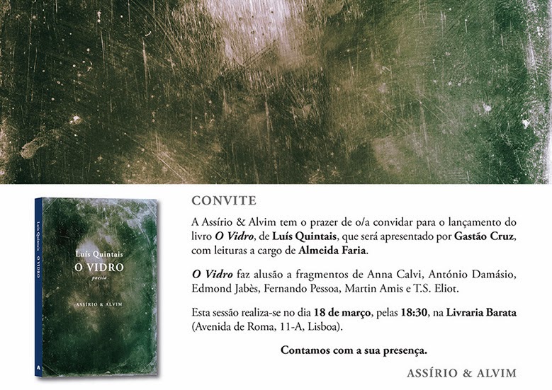 A Assírio & Alvim tem o prazer de o/a convidar para o lançamento do livro O Vidro, de Luís Quintais, que será apresentado por Gastão Cruz, com leituras a cargo de Almeida Faria.